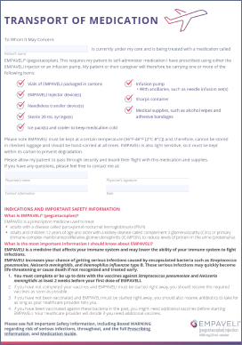 The EMPAVELI Travel Letter explains the supplies you need to travel with in order to self-administer EMPAVELI. Presenting this letter to customs and security officials, along with your prescription, will help ensure you move through security easily.